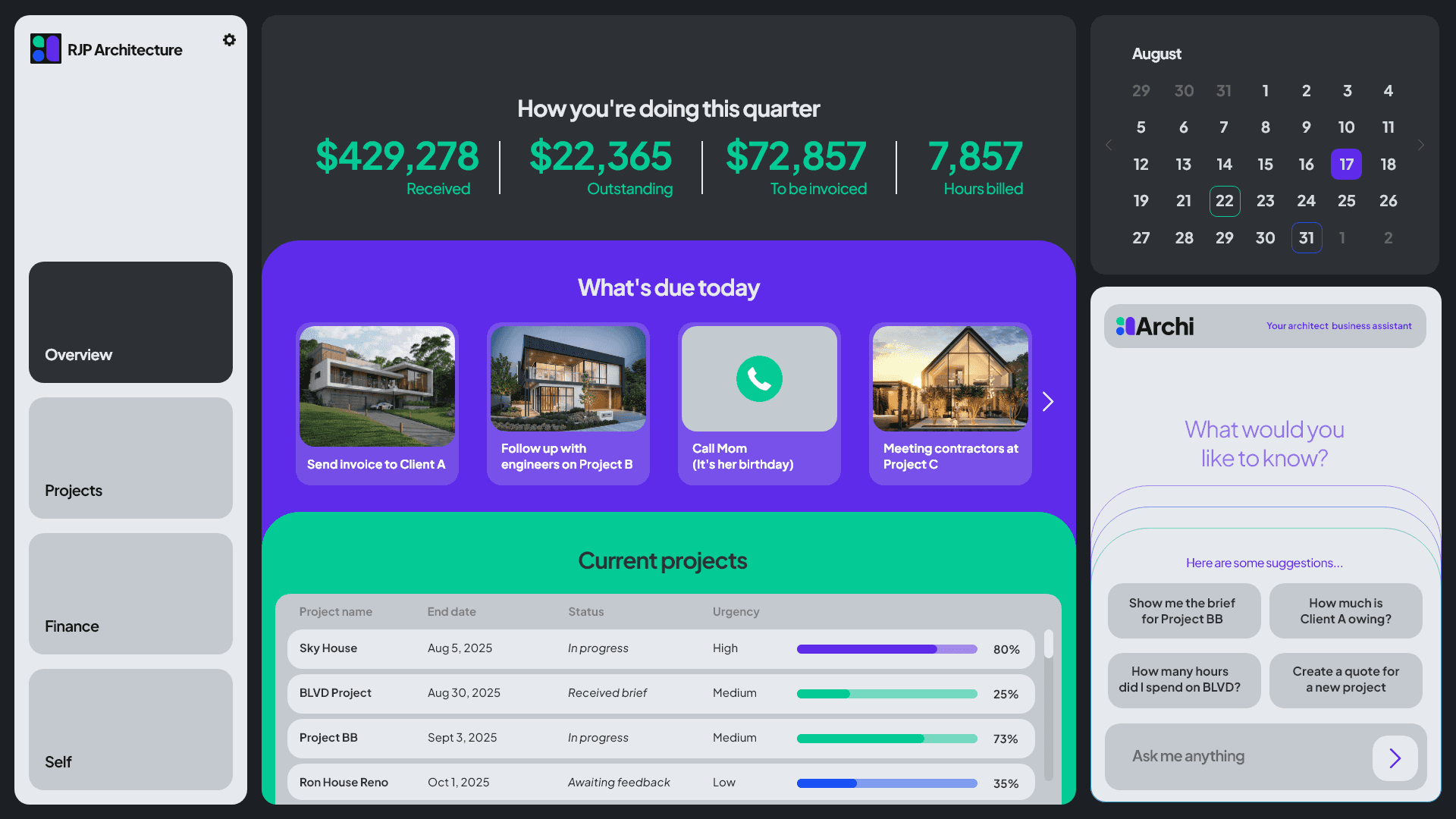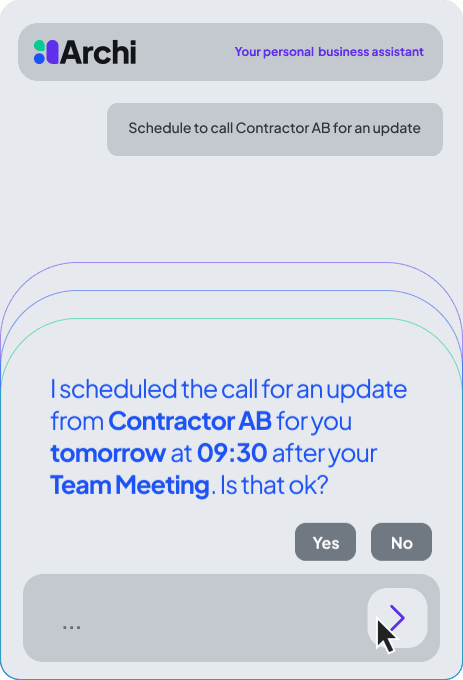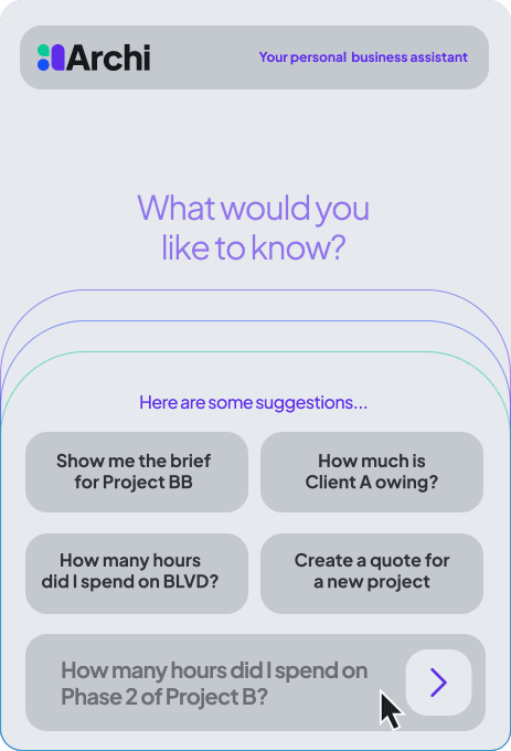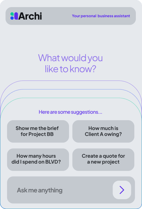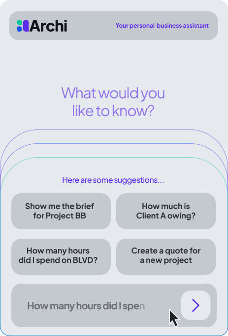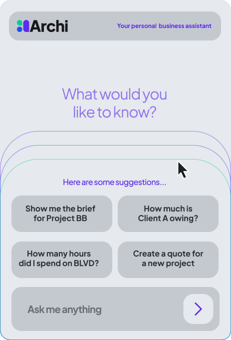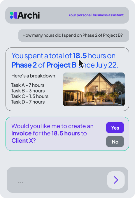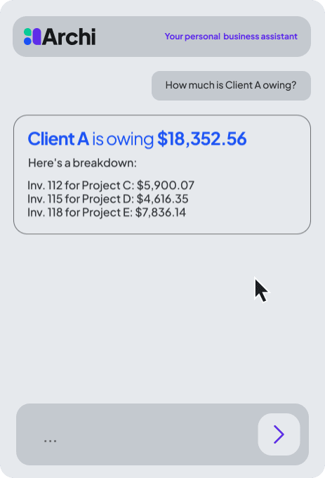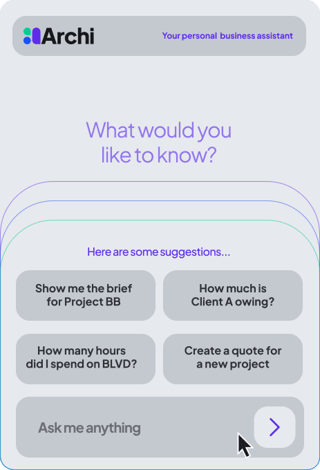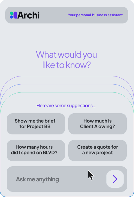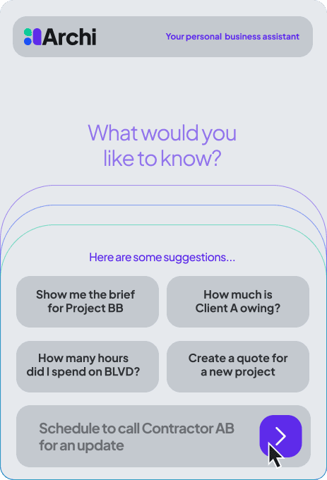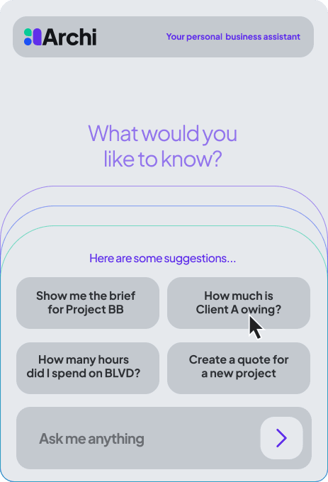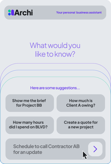 At the heart of the platform is Archi (ah-chee)— your personal AI business assistant. Archi doesn’t just organize your work; he helps you run your business in the following ways.